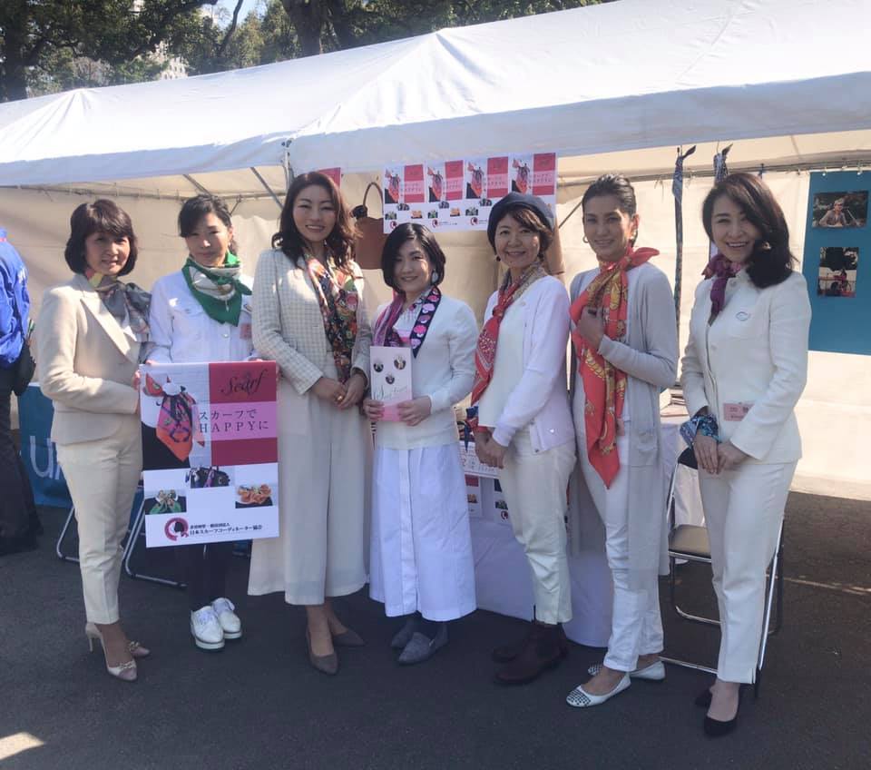 2019年は日比谷公園内ブースにて日本スカーフコーディネーター協会の講師やアドバイザーがミニスカーフ(ツイリータイプ)を特別価格で販売。