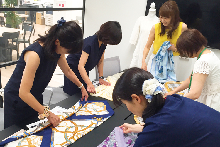 サロンにお越しくださるお客様にパーソナルカラーや骨格スタイル、メイクなどのレッスンを行っておりますが、更に、ファッション提案の幅を広げる為に、スカーフ講座、ストール講座を受講しました。