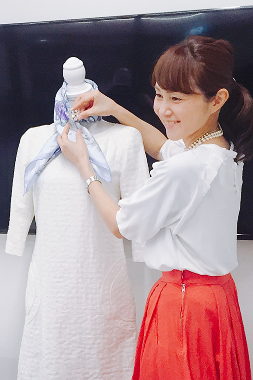 普段のコーディネートをより一層華やかにランクアップさせてくれるスカーフ、ストールアレンジをお伝えさせていただくことを通じて、多くの女性のお客様から温かいお言葉をいただいたり、皆様の楽しそうな笑顔を拝見する度に、私自身もとても嬉しくパワーをいただいております。